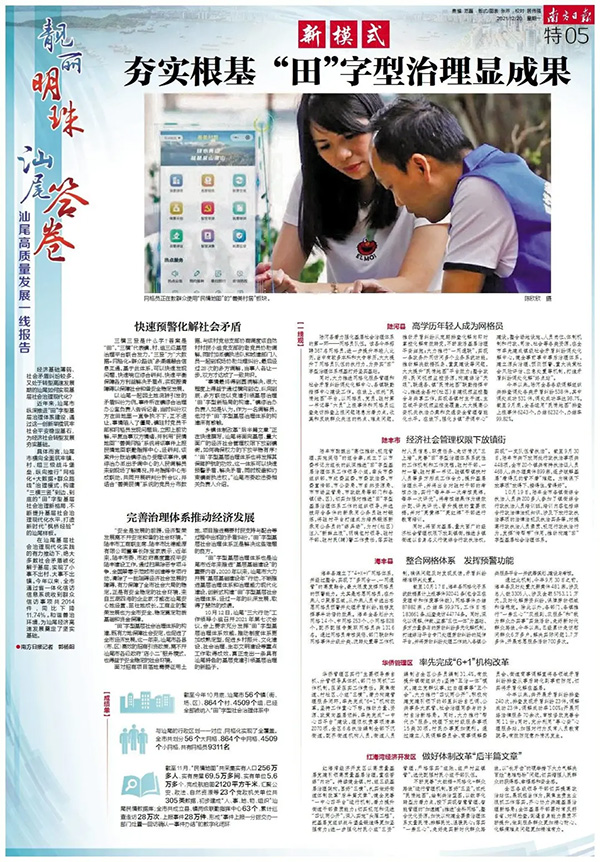 具體而言,汕尾市橫向全面筑牢鎮(zhèn)、村、組三級戰(zhàn)斗堡壘,縱向推行“網(wǎng)格化+大數(shù)據(jù)+群眾路線”治理模式,構(gòu)建“三橫三豎”到邊、到底的“田”字型基層社會治理新格局,不斷提升基層社會治理現(xiàn)代化水平,打造新時代“楓橋經(jīng)驗”的汕尾樣板。