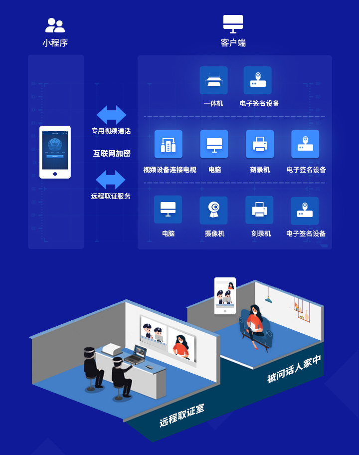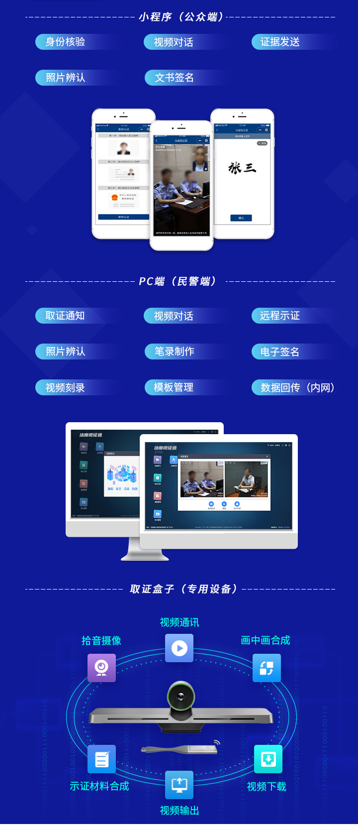 系統(tǒng)還具有快捷筆錄、群體性案件協(xié)同問話、專家遠程指導(dǎo)偵查、筆錄過程監(jiān)督、案件關(guān)鍵線索提取、自動核查、聯(lián)盟核查、交叉分析等功能,支持與多個廠家的電子簽名按捺設(shè)備對接,實現(xiàn)筆錄文書電子化。法度“視證通”貼合基層執(zhí)法業(yè)務(wù)需求,在安全可靠,滿足法律效力要求的前提下,通過遠程可視對話、遠程示證、文件簽字、詢問筆錄制作、全過程錄音錄像、視頻刻錄等功能,實現(xiàn)執(zhí)法人員與取證對象之間進行遠程取證。