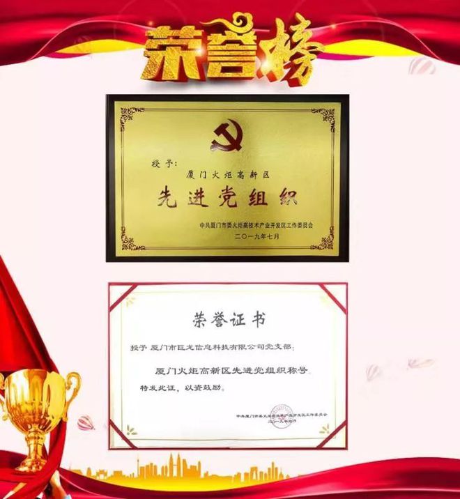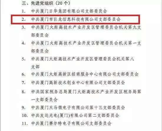 中共廈門市巨龍信息科技有限公司支部委員會榮獲“廈門火炬高新區(qū)先進黨組織”稱號。