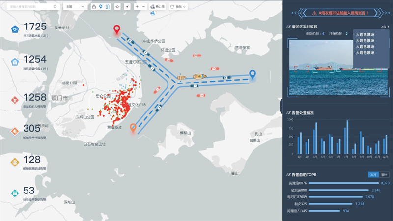 2、實(shí)現(xiàn)對船舶工作區(qū)域的監(jiān)管,對裝貨區(qū)、卸貨區(qū),或者其他敏感區(qū)域等自動監(jiān)控其他入侵船舶行為,以規(guī)范監(jiān)管區(qū)域的正常運(yùn)作。
