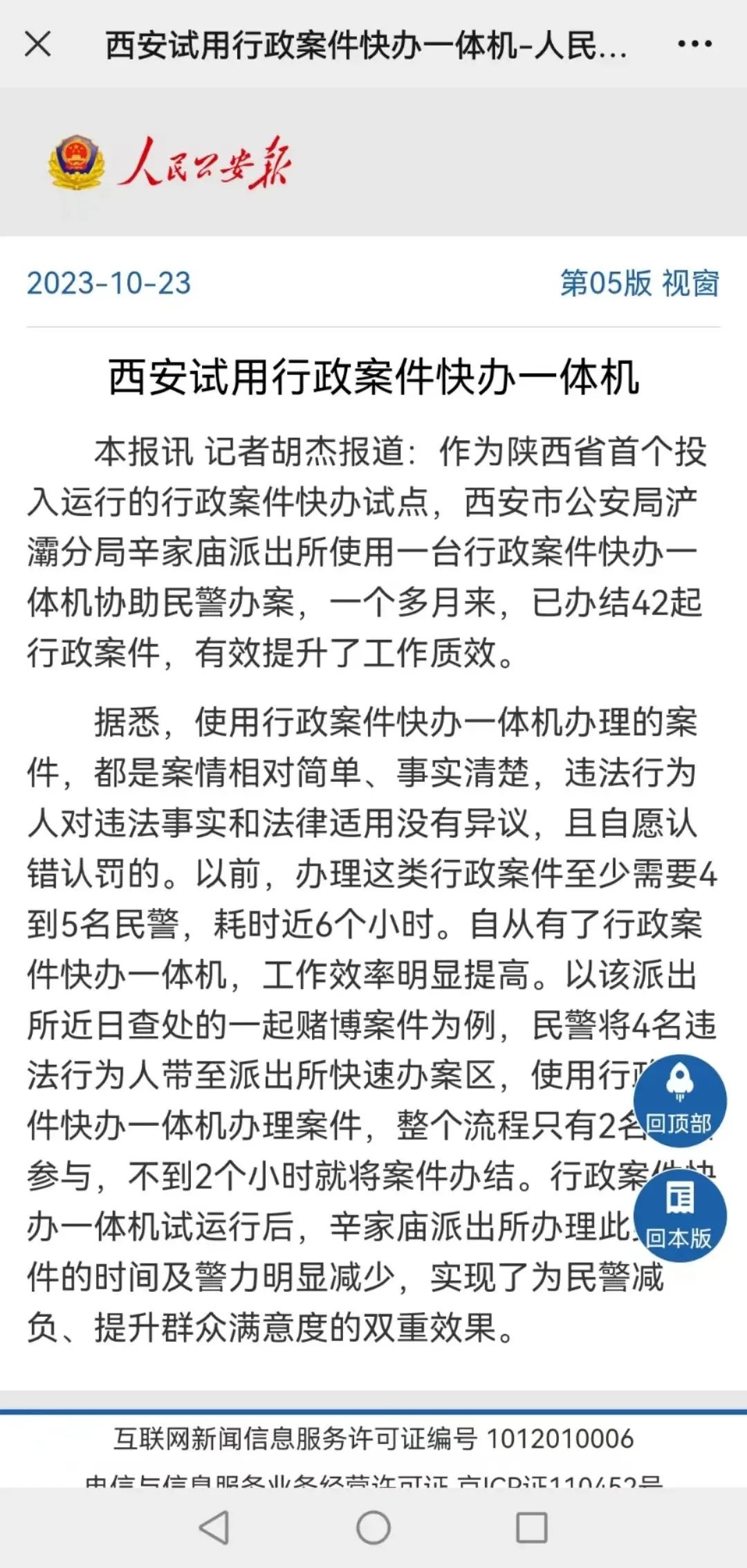 本報訊 記者胡杰報道:作為陜西省首個投入運行的行政案件快辦試點,西安市公安局浐灞分局辛家廟派出所使用一臺行政案件快辦一體機協(xié)助民警辦案,一個多月來,已辦結(jié)42起行政案件,有效提升了工作質(zhì)效。