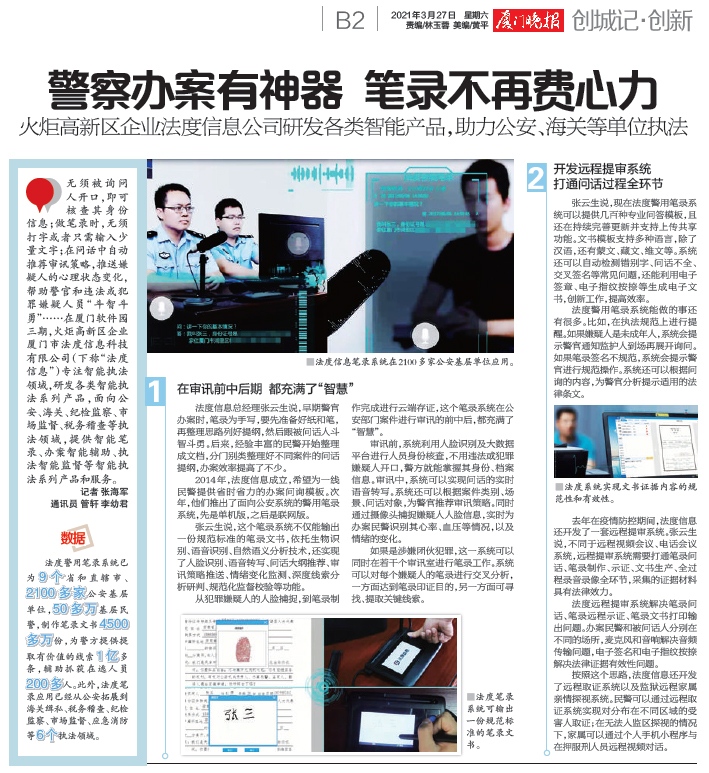 近日,廈門晚報(bào)刊發(fā)《警察辦案有神器 筆錄不再費(fèi)心力》,專門介紹巨龍信息的子公司——法度信息公司通過科技技術(shù)為執(zhí)法工作減負(fù)、增效,保障規(guī)范執(zhí)法,依托科技的力量為法治建設(shè)助力,引起各界廣泛關(guān)注。