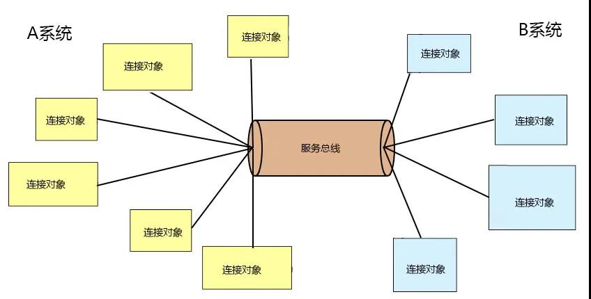 隨著技術的發(fā)展,在服務數(shù)據(jù)共享上,采用總線連接方式取代點對點的連接方式,具體是將多對多的連接方式變成一對一的方式,所有連接方均與總線連接,然后通過總線再連接到需要連接的對方。