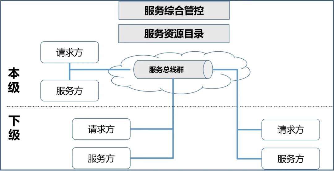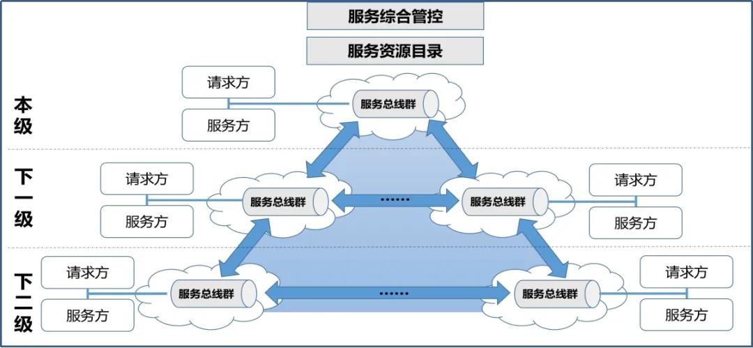 ■服務總線在建設單位和下屬需要獨立運行的單位分別部署,且各單位接入的服務方、請求方也都掛接在本單位專屬的服務總線上,服務總線之間相互通信,形成一個完整的服務API網(wǎng)絡。