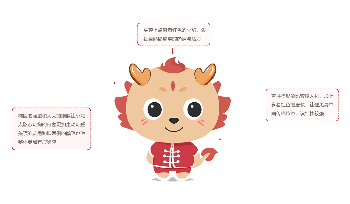 小龍人是以中國(guó)古老傳說(shuō)中的龍為原型設(shè)計(jì)的,龍?jiān)⒁庵疫\(yùn)與成 功;配色也接近龍的顏色,以紅黃顏色為主。小龍人的膚色以黃色為主, 黃色有著太陽(yáng)般的光輝,讓人有健康陽(yáng)光、活力四射、積極向上的感覺。